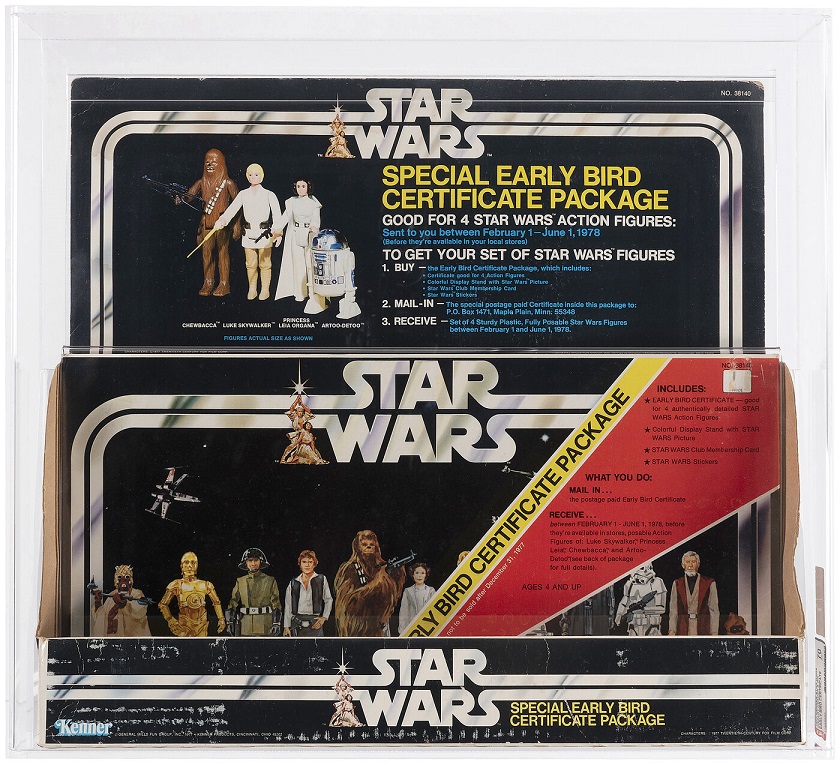 The rare Star Wars Special Early Bird Certificate Package store display AFA 70 sold for $112,100, setting a world record for an action figure line display piece. The thin cardboard header/bin store display was made to hold the Early Bird Certificates that Star Wars fans could purchase to guarantee that they’d receive the first round of toys once they were available. The display header features actual size photos of the action figures, including the Luke Skywalker figure with the double-telescoping lightsaber. An example of one of the certificates is included with the display and is situated as it would have appeared in stores. It is one of the most sought-after Star Wars display pieces and it is the first time this display has ever been offered at auction.