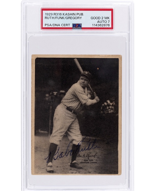 A 1929 Babe Ruth signed card R316 Kashin Publication card PSA 2 with PSA/DNA 7 autograph hammered for $47,258. The 3-1/2” x 4-1/2” card presents a beautiful image of Ruth in his Yankees uniform in a full figure batting pose that is boldly signed near the bottom. The card is also signed on the back by Major League Baseball players Paul Gregory and Elias Funk. Finding prewar signed baseball cards is very difficult. There was a time when it was considered taboo to have a baseball card signed, resulting in a very small number of cards signed by baseball greats like Babe Ruth. In fact, there are only two other graded signed examples of this card, according to the PSA/DNA population report. The example at Hake’s is the highest graded of the three.