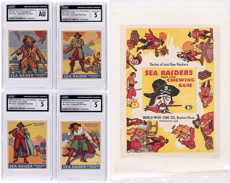 The 1933 World Wide Gum Sea Raiders copyright file copy complete US card set CGC graded plus wrapper realized $68,964, more than triple the $20,000 estimate. While this is a highly coveted non-sport card set on its own, what takes this to another level is that it is a full copyright file set submitted to the US Patent Office before the cards were sold in stores. Two complete sets were submitted at the time, one held by the Federal Government and the other returned to World Wide Gum, which is the set that Hake’s sold.