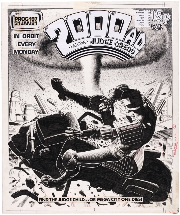 The Judge Dredd – 2000 AD Prog 197 cover by Brian Bolland from 1981 totaled $51,920. It features the tough law enforcer being blown from his Lawmaster motorcycle as an atomic bomb explodes in the background, destroying multiple Mega-City One buildings. The art has been signed by Bolland in red felt tip pen. This cover was made for the issue that featured the first part of the “Pirates of the Black Atlantic” story.