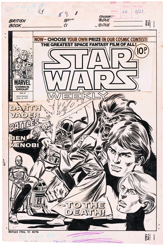 The Star Wars Weekly #8 cover by Gil Kane was featured on Marvel UK’s adaptation of the American Star Wars comics brought $32,450. The UK books were typically split into smaller segments and published over a number of issues with the movie adaptation stretching into 12 issues and featuring eight covers exclusive to the UK market. This cover captures the lightsaber battle between Obi-Wan Kenobi and Darth Vader as Luke Skywalker, Han Solo, Chewbacca, C-3PO, and R2-D2 witness the fight.