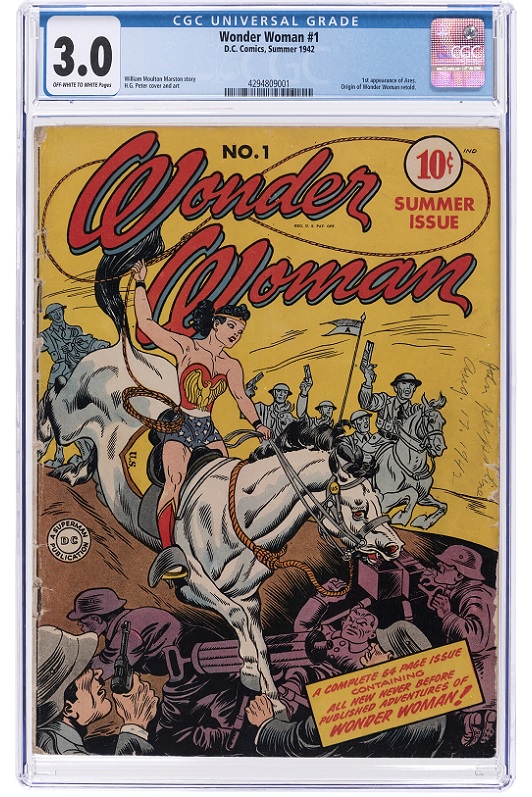 Leading the charge for comics was Wonder Woman #1 CGC 3.0, the first issue of Wonder Woman’s solo title, which reached $29,205. One of the most important keys featuring Diana of Themyscira, the book retells her origin story and provides the first appearance of Ares.
