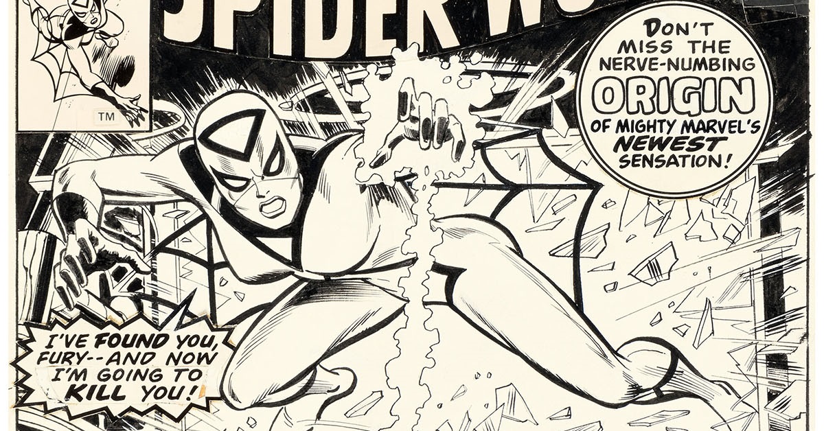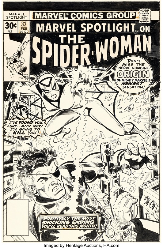 Gil Kane’s Marvel Spotlights #32 original cover from Spider-Woman’s debut took the top spot, realizing $690,000. A creation of Archie Goodwin and Marie Severin, Spider-Woman appears at the top of the cover lunging at Nick Fury because she was brainwashed by Hydra to kill him. This sale set a new record for Gil Kane art.