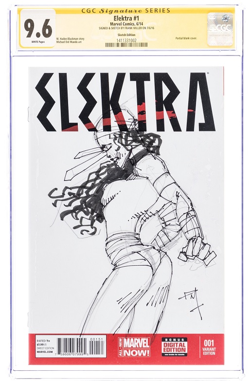 The original art auction contains Dave Cockrum and Sam Grainger’s Classic X-Men #5 story page 12 with the Giant-Size X-Men co-creator producing a new scene for a reprint of one of his earliest X-Men stories. Frank Miller renders a sketch of one of his signature creations for the Elektra #1 sketch edition CGC 9.6 Signature Series.
