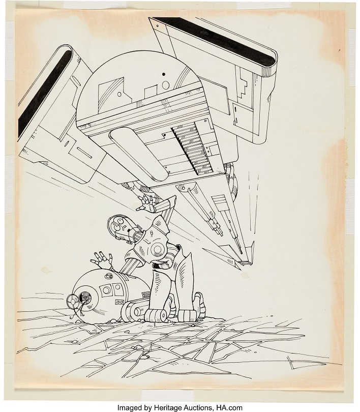There are 20 pieces of original art, like the Star Wars: Droids C-3PO original line art by Alice Carter. Showing C-3PO and R2-D2 in danger, the art is the only known surviving packaging depiction of the droids, according to Heritage. John Alvin’s original concept painting for the unreleased Star Wars concert series poster, Greg Hildebrandt’s portrait of Darth Vader’s funeral pyre mask, and Olivia De Berardinis’ Grogu painting are also among the original art lots.