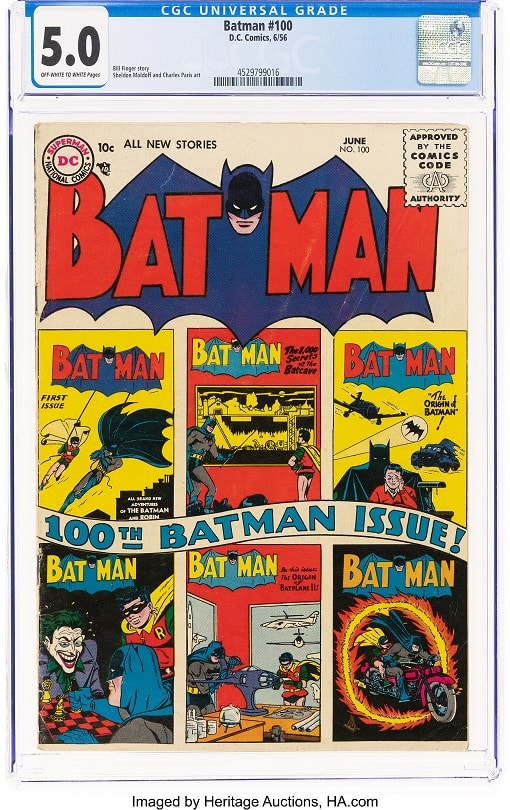 The comic auction includes Green Lantern #85 CGC 3.5 and #86 CGC 7.5 with Dennis O’Neil and Neal Adams’ powerful story about Speedy battling a heroin addiction. The milestone Batman #100 CGC 5.0 presents six iconic covers from the first 100 issues of the series.