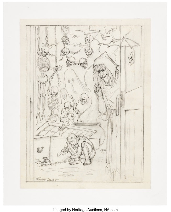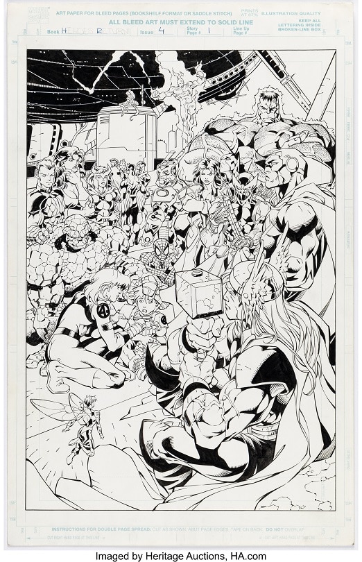 The original art auction is led by Salvador Larroca and Scott Hanna’s Heroes Reborn: The Return #4 splash page 1 that captures the moment that the Fantastic Four, Avengers, Inhumans, Spider-Man, and Hulk unite to restore reality. Johnny Craig’s The Haunt of Fear #15 (#1) cover recreation preliminary art revisits one of his classic covers for the debut issue of the horror title.