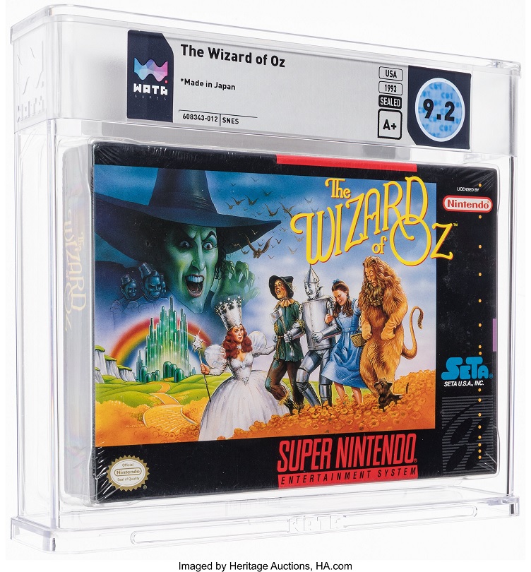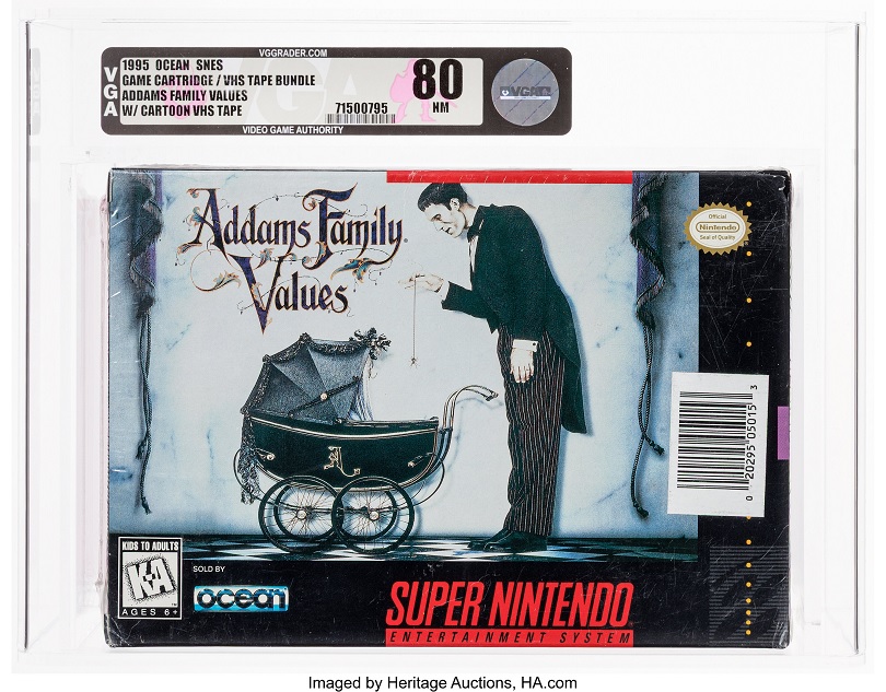 Heritage’s video game auction offers The Wizard of Oz WATA 9.2 sealed for Super Nintendo, which is the highest graded copy of the game based on the 1939 film. Addams Family Values VGA 80 sealed for Super Nintendo is similarly based on the movie, and is offered with a VHS copy of The Addams Family animated show from Hanna Barbera.