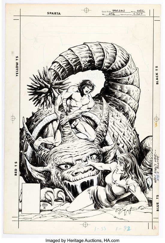 In the original auction, Heritage has Mark Bagley and Scott Hanna’s Thunderbolts #18 story page 21 with founding members Mach-1, Songbird, Atlas, Meteorite, and Jolt. Ernie Chan and Alfredo Alcala’s Tarzan #256 cover captures Tarzan in battle with a horned beast that is about to attack Jane.