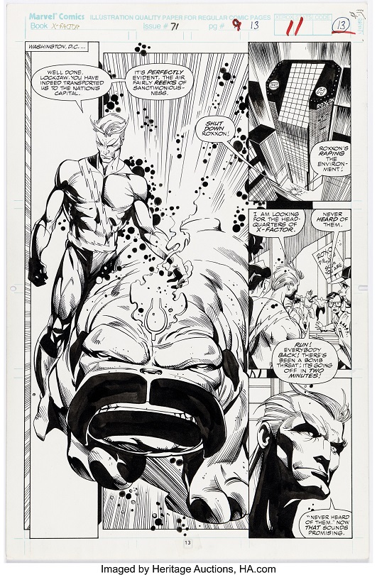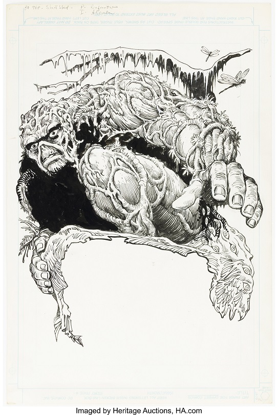 The original art auction contains Larry Stroman and Al Milgrom’s X-Factor #71 story page 9 with Quicksilver’s debut in the new X-Factor and his first time as a member of an X-Team, plus an appearance by Lockjaw. Carmine Infantino and Alfredo Alcala’s Swamp Thing t-shirt design illustration features the monster emerging from the bayou.
