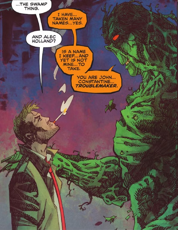 Once he met Swamp Thing, Constantine became his guide, protector, voice of omen, and taught him how to amplify his powers. They worked together in many situations, including fighting off the Damnation Army from summoning the Antichrist.