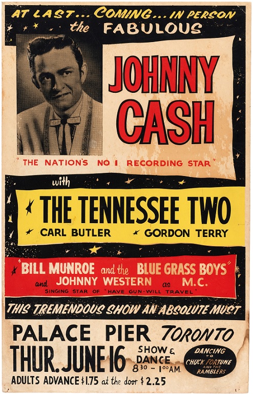 Fans of the Man in Black now have the opportunity to bid on a Johnny Cash concert poster for a 1960 concert in Toronto, Canada that is likely unique. The 14” x 22” window card on thin cardboard promotes his concert at Toronto’s Palace Pier on June 16, 1960. It features a smiling Johnny Cash wearing a western string bow tie and he is billed as “The nation’s No. 1 recording artist.” The poster also advertises the Tennessee Two, Carl Butler, Gordon Terry, Bill Monroe and His Blue Grass Boys, and Johnny Western.