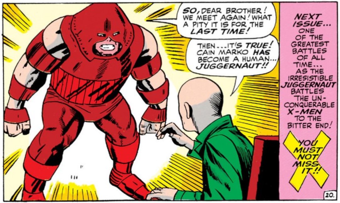The prolific creative team of Stan Lee and Jack Kirby introduced Juggernaut in X-Men #12 (July 1965). He was introduced as Cain Marko who becomes stepbrothers with Charles Xavier when his father and Charles’ mom get married. His father, Kurt, shows Charles favoritism which builds resentment in Cain, who in turn bullies his stepbrother.