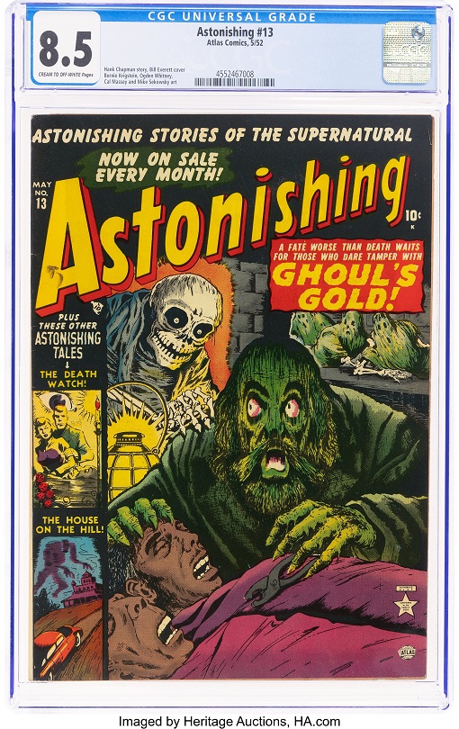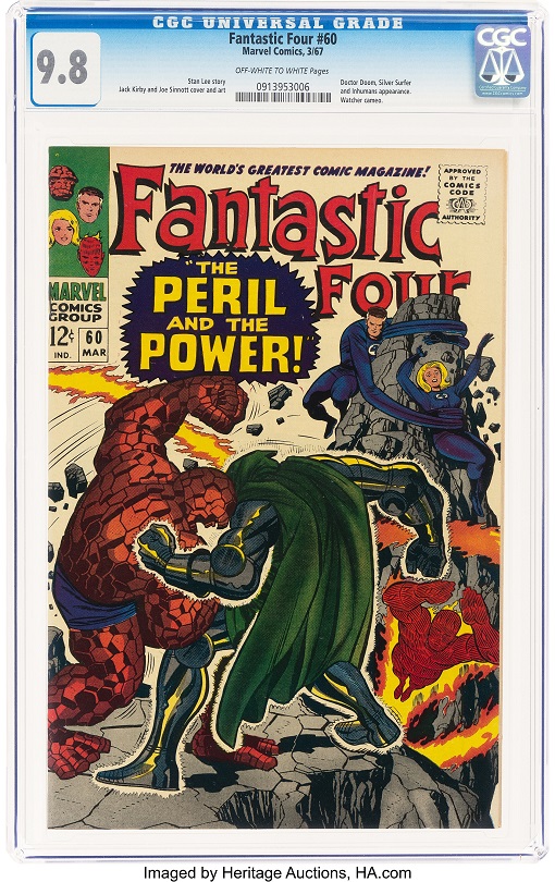 Heritage’s comic auction offers Astonishing #13 CGC 8.5 with a vivid pre-Code skull and ghoul cover by Bill Everett. Fantastic Four #60 CGC 9.8 features a story about Marvel’s First Family fighting Doctor Doom who is wielding the Power Cosmic.