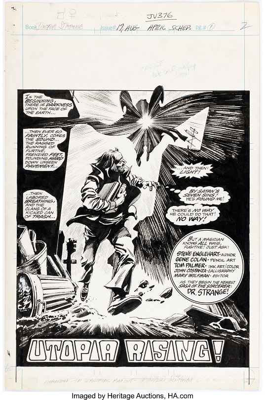 The original art auction is led by John Buscema and Tom Palmer’s Thor #276 story page 4 depicting Odin presiding over the trial of Loki (who appears in five of the six panels). Gene Colan and Tom Palmer’s Doctor Strange #17 splash page 1 opens “Utopia Rising!” with the Sorcerer Supreme streaking through a shadowy alley.