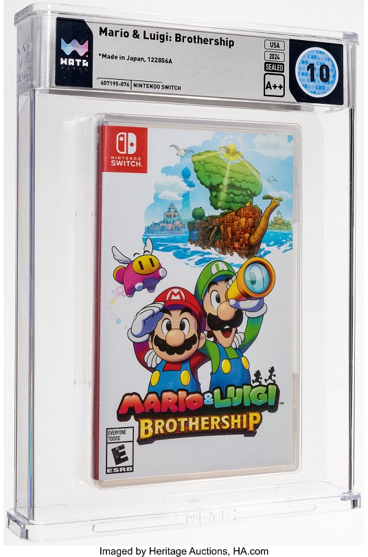 In the video game auction, Heritage has Mario & Luigi: Brothership WATA 10.0 sealed for Switch featuring a high seas adventure as the brothers travel around the world. MUSHA: Metallic Uniframe Super Hybrid Armor VF for Genesis Seismic puts players in the pilot seat of a mech as it goes through multiple challenges.