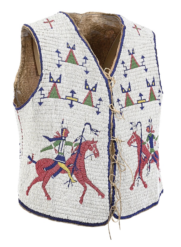 A magnificent example of Native American artistry, a Northern Plains / Sioux pictorial beaded vest was a scene-stealer at the auction preview. Its front panels were decorated with stunning images of two mounted warriors with feathered coup sticks, while the back showed two mounted braves dressed in full regalia, including headdresses and coup sticks, with an upper portion adorned with two pole-mounted American Flags. Described by Morphy’s specialist cataloger as one of the nicest Native beaded vests ever to be offered by the Pennsylvania-based auction house, it rose to $19,200 against an estimate of $8,000-$12,000.