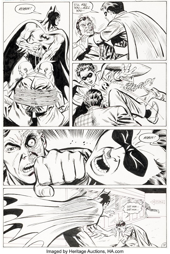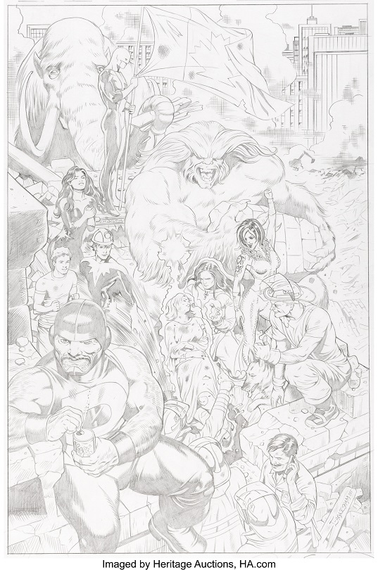 The original art auction is led by Dave Cockrum and Don Heck’s Batman #11 story page 12 capturing Robin/Jason Todd violently lashing out at Two-Face to avenge his father’s murder. Dale Eaglesham’s Alpha Flight #8 splash page 19 showcases the entire team of Canada heroes with Guardian waving the country’s flag.