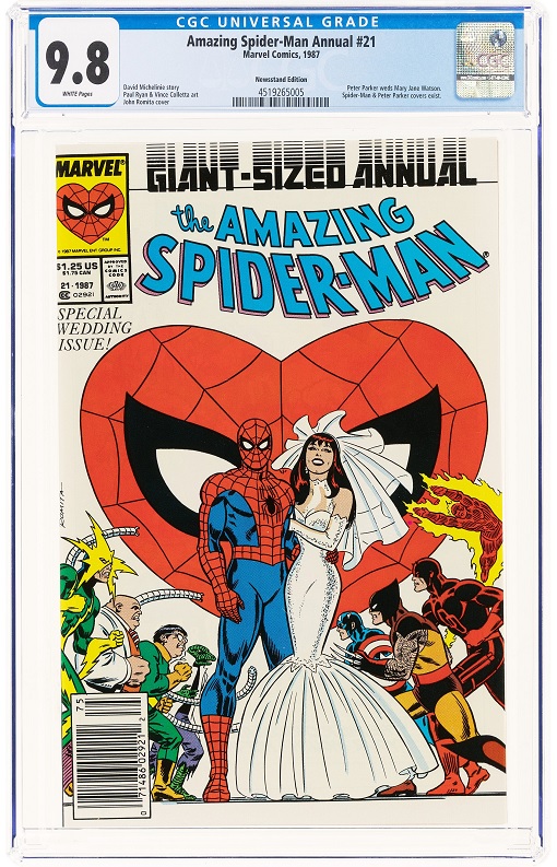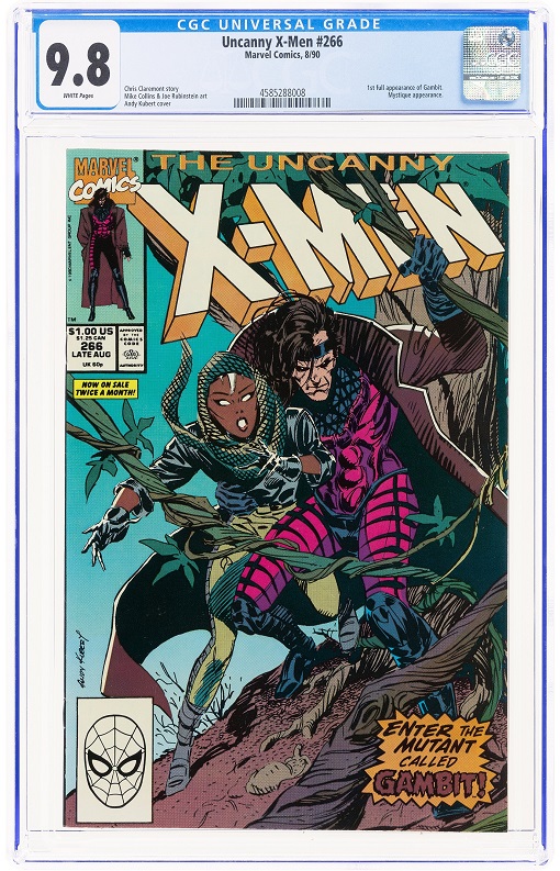 The comic auction features The Amazing Spider-Man Annual #21 CGC 9.8 newsstand edition with the story of Peter Parker and Mary Jane Watson’s wedding, starting with a cover by John Romita Sr. X-Men #266 CGC 9.8 presents the first full appearance of the card throwing, trench coat wearing Gambit.