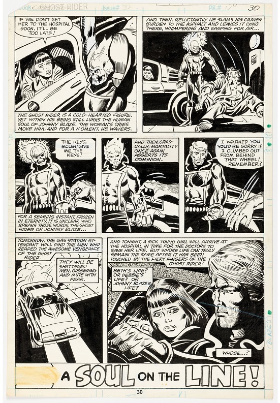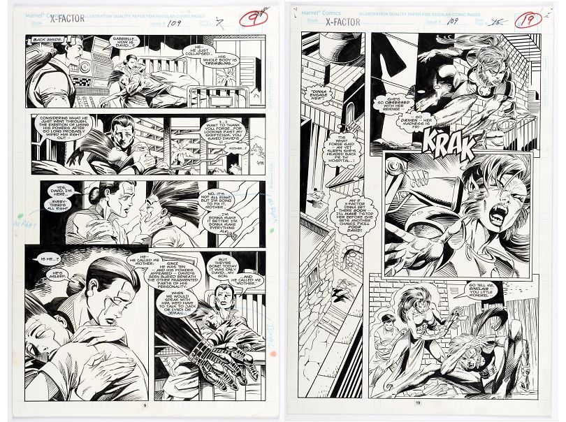Heritage’s original art auction is led by Jan Duursema and Al Milgrom’s X-Factor #109 “Legion Quest” story pages 7 and 15 showing Legion being comforted by his mother and the other sees Mystique sneaking up on Wolfsbane. Don Perlin’s Ghost Rider #36 story page 17 depicts the Spirit of Vengeance reverting from his flaming skull form back into Johnny Blaze.