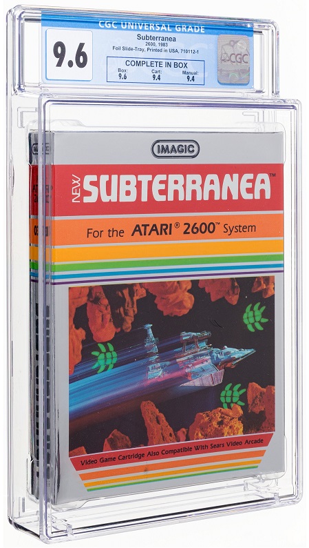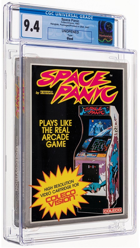 The video game auction features the side-scrolling shooter Subterranea CGC 9.6 CIB for Atari 2600, which is one of the harder to find games in Imagic’s silver box lineup. Space Panic CGC 9.4 glue seal for ColecoVision is a translation of Universal’s 1980 arcade classic; it is one of just two graded by CGC.