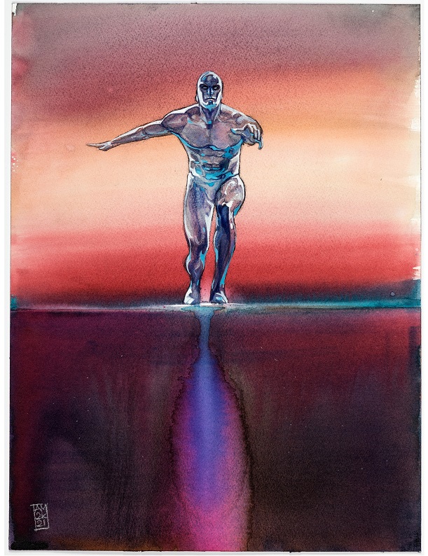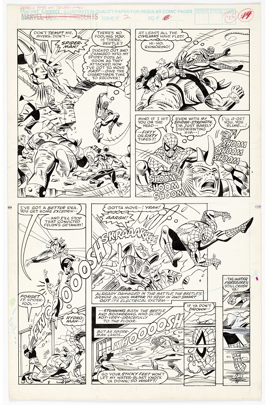 Heritage’s original art auction is led by Alex Maleev’s Silver Surfer painting that captures the cosmic wanderer surrounded by beautiful colors in space. Al Milgrom’s Deadly Foes of Spider-Man #2 story page 19 depicts the Webslinger in every panel as he fights Beetle, Rhino, Boomerang, and Hydro-Man.