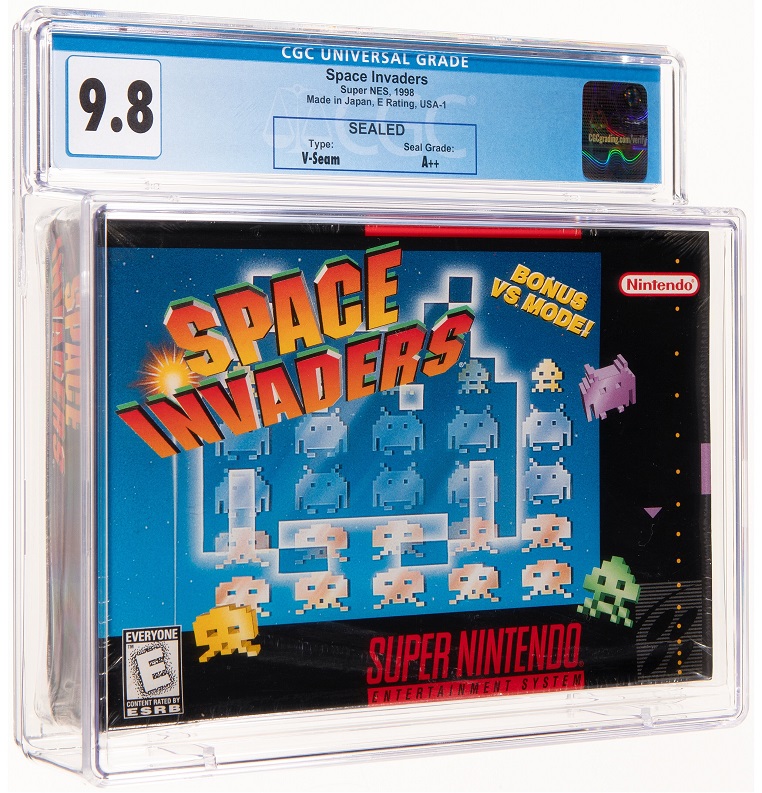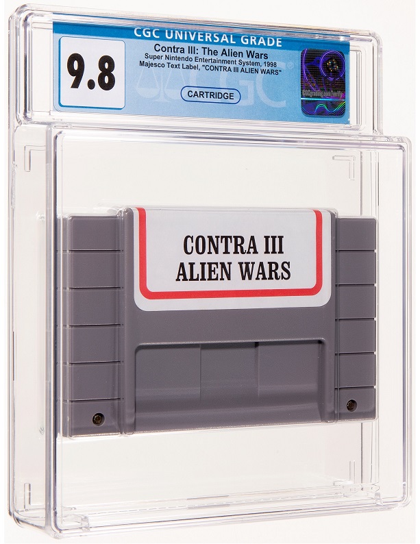 The video game auction boasts a Contra III: The Alien Wars CGC 9.8 for Super Nintendo rare Majesco budget release. These low cost editions were distributed in clear plastic bags with basic text labels, making them starkly different from the original versions. Space Invaders CGC 9.8 sealed for Super Nintendo is a faithful reproduction of the 1978 arcade game down to the minimalist visuals.