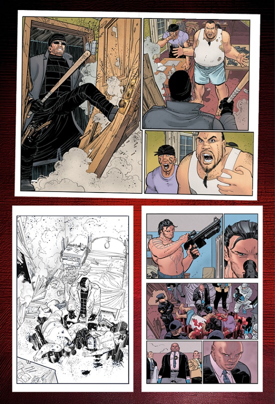 Pledge levels on the Kickstarter campaign began at £18 ($24) for the first printing of the 64-page graphic novel, and a copy signed by Millar and Romita Jr. is £30 ($40). The hardcover is £34 ($45), a signed hardcover is £45 ($60), the signed black and white artist’s edition with no lettering is £50 ($67), and the signed magazine sized edition is £65 ($87). Additional levels include trading cards, stickers, an A3 poster by Dave Dorman, t-shirt, baseball hat, and more. The top pledge level at £3,000 ($4,047) gives backers the opportunity to be written and drawn into the book as one of the murder victims.
