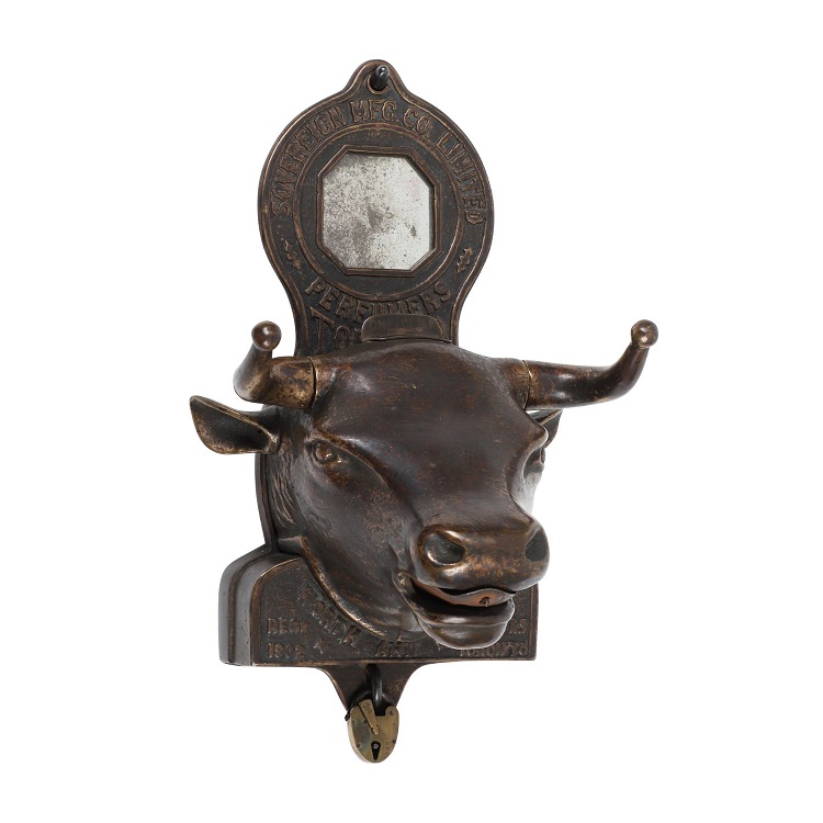 The Saturday morning session on December 6 will be led by the Canadian circa 1902 Worth-Martin coin-operated cast iron bull’s head perfume dispenser (“Take the Bull by the Horns!”), made in Toronto by the Sovereign Mfg. Co. Ltd. Pull the bull’s horns forward and the coin-op dispenses a perfume mist through the bull’s mouth (often onto a handkerchief). It would have been mounted in a ladies’ powder room or restroom. The presale estimate is $6,000-$9,000.