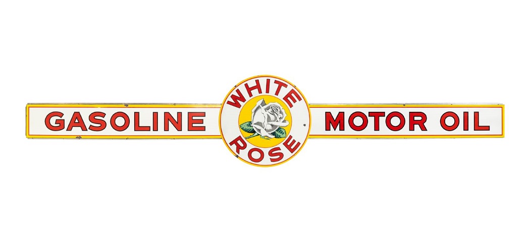 The other is a Canadian 1946 single-sided, three-piece porcelain White Rose Service Station banner sign set, with all three pieces showing excellent color and gloss. The panel overall is 17 inches tall by 94 inches wide. The circle midway says “White Rose” with the iconic White Rose logo, graded 8.75. The left banner reads “Gasoline” and is graded 8.75. The right of the banner reads “Motor Oil” and is graded 9.25. Each piece is marked “P&M 47” on the lower right edge.