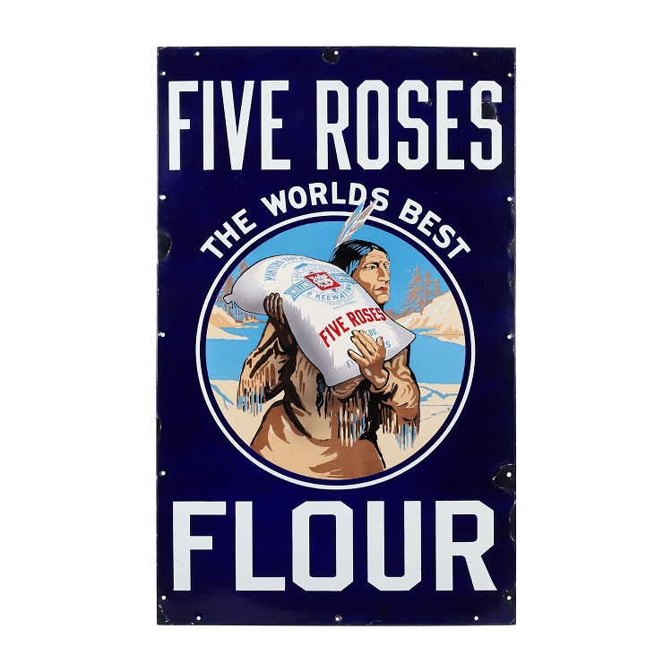 Two lots with $20,000-$25,000 pre-sale estimates will cross the auction block the morning of September 14. The first is a Canadian 1920s single-sided porcelain sign for Five Roses Flour, which became a pantry staple across Canada following its launch in 1888 by the Lake of the Woods Milling Company in Keewatin, Ontario. Its famous 1915 cookbook was distributed free with a purchase. The field of the 42-inch by 26-inch sign is unrestored and superb. Grade: 8.5.