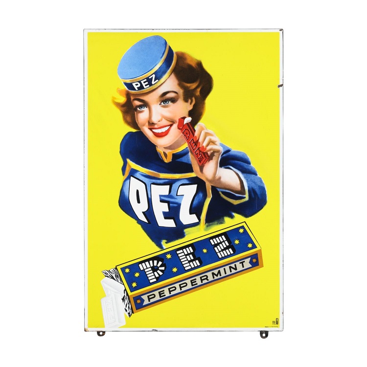 The second is a German 1950s single-sided porcelain sign for Pez peppermint candies, invented in 1927 in Austria by Eduard Haas III, originally as a breath mint marketed for adults. Later, the introduction of the familiar dispensers transformed Pez into a beloved treat for children and collectors worldwide. The sign is graded highly at 9.5 and measures 29 inches by 19 inches. The graphic design is after artwork by Gerhard Brause. It’s marked “Made in Germany” lower right.
