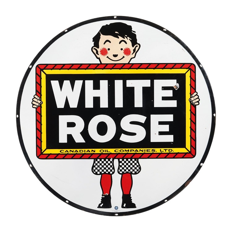 Also up for bid in the morning on Day 2 is a Canadian 1940s double-sided porcelain sign for White Rose Gasoline, round and 48 inches in diameter. Side A is graded 8.75; side B, 8.5. White Rose was a Canadian petroleum company affiliated with Canadian Oil Companies, Ltd., which gained widespread distribution across Ontario and the Maritimes (estimate: $9,000-$12,000).