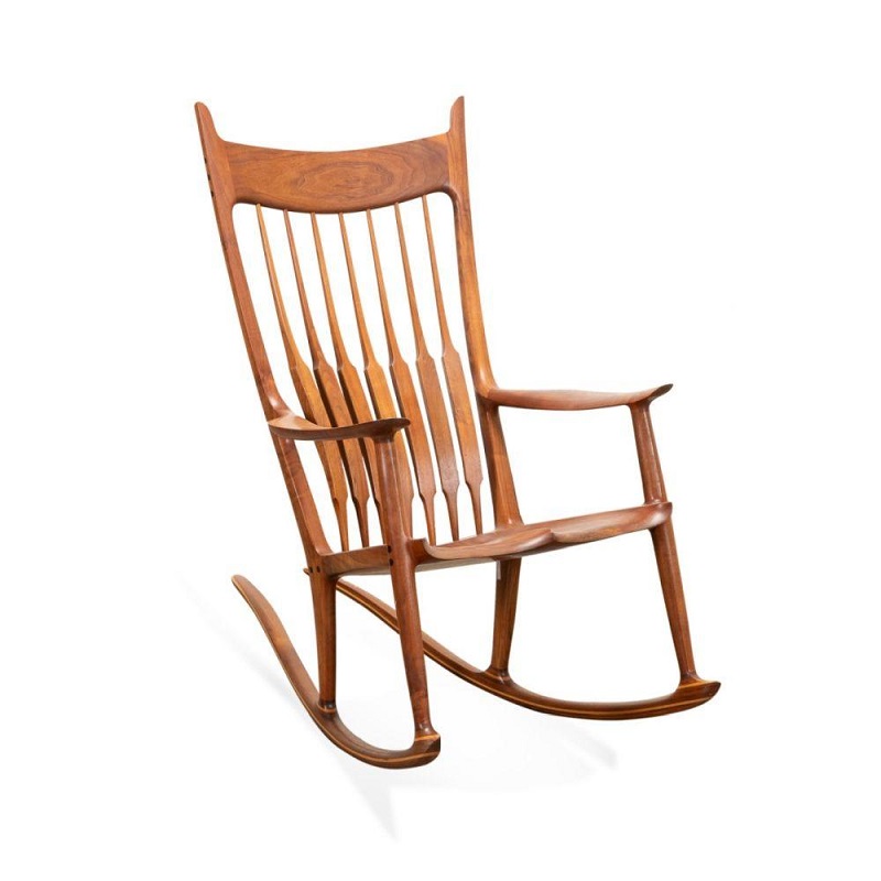 The Brazilian rosewood and mixed wood rocking chair by Sam Maloof was crafted in 1988 and is signed, dated and numbered (45) to the underside of the seat. Similar rocking chairs by Mr. Maloof are held in permanent collections of the Los Angeles County Museum of Art, The Museum of Fine Arts in Boston, the White House Collection of American Crafts, and The Smithsonian American Art Museum in Washington, DC. The one in the auction has a presale estimate of $20,000-$30,000.