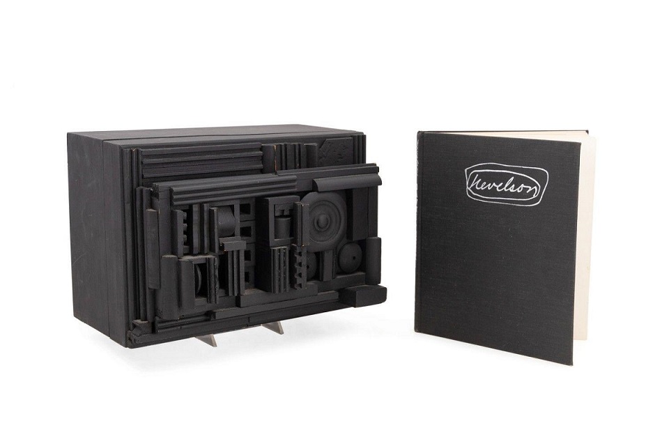 There are also two offerings in the sale from the Ukrainian-born American sculptor and painter Louise Nevelson (1899-1988). The first is an apparently unsigned wood and black paint sculpture, 9-1/2 inches tall, titled Cryptic Cord #1389 (1966-1967). The work has labels to the underside for The Pace Gallery (NY) and Richard Gray Gallery (Chicago). The sculpture should change hands for $8,000-$12,000.