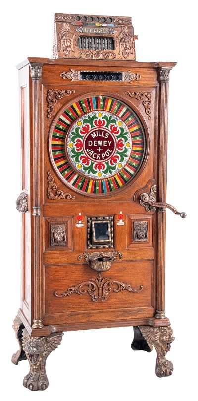 A fantastic array of coin-operated machines awaits bidders, including gambling, vending and music machines of the highest caliber. A Mills Novelty Co. (Chicago) 5¢ Dewey Jackpot slot machine with a front-glass graphic and copper flash castings is housed in a quartered oak cabinet (replaced back door). It appears to have undergone a restoration in its earlier days. The unit has original castings (with the exception of doghead castings), and the front glass is an older replacement with lustrous lettering. The colorful tin litho wheel is in excellent condition. In VG condition, its auction estimate is $10,000-$20,000.