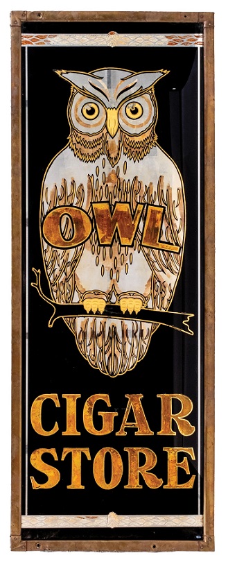 Every imaginable type of signage can be found in the auction lineup, including one of the very best reverse-painted glass signs known to exist. Promoting the wide range of cigars sold under the “Owl” brand, it is of a type that would have been placed prominently in a shop window or used as a hanging display in the late 19th or early 20th century. This important piece, with graphics intended to stop passersby in their tracks, features an image of a perched owl with the phrase “CIGAR STORE” in large, bold lettering. The sign measures 30-1/4 inches by 80 inches and retains its original frame. Graded a strong condition 9.0+, it will be introduced with a presale estimate of $30,000-$60,000.