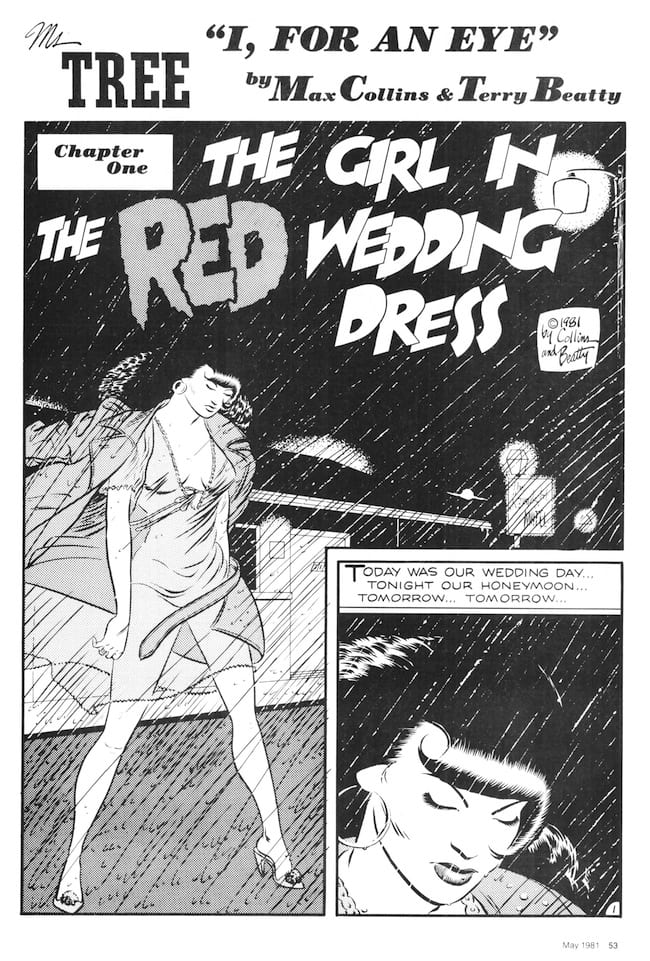 Ms. Tree is inspired by Velda, the kick-butt secretary in Mickey Spillane’s hit Mike Hammer series. The basic idea of Ms. Tree is: “What if Velda and Mike Hammer eventually got married, and on their honeymoon, he was murdered?” Ms. Tree is sharp, insightful, hard-nosed, somewhat caustic, and when called for, very deadly. The series primarily revolves around her vendetta against the Muerta family, with her methods often include deadly violence. The series also saw her face serious consequences for her actions, such as arrest, imprisonment, commitment to a mental hospital, and involuntary medication.