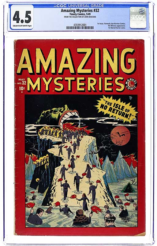 As MyComicShop’s April Prime Auction closes, they are looking ahead to some of the books that will be added to their website soon. From the Collection of John Buscema, they will offer Amazing Mysteries #32 CGC 4.5. This was the first horror comic produced by Marvel and includes a letter from the editorial staff directed at parents emphasizing the benefits of “the right of the public to read what they want to read.” It also makes it clear that they employ a consultant from the New York City Board of Education.