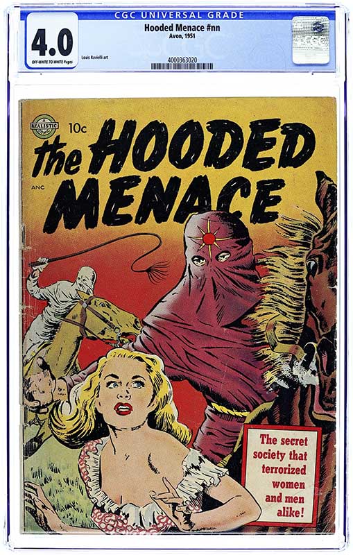 They have a copy of Hooded Menace #nn CGC 4.0 which features a woman being tormented by hooded villains. It was very common tropes at the time, though according to MyComicShop, this comic is based on true events that took place in the Pacific Northwest. Veterans from the Spanish-American War migrated and began preying on the new, small communities in the region necessitating military intervention by the federal government.