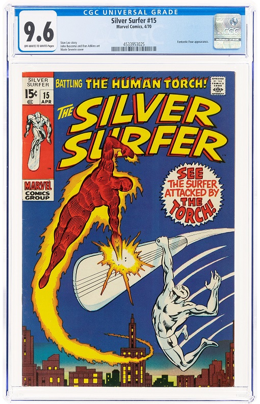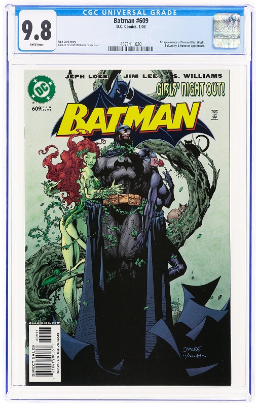 The comic auction offers The Silver Surfer #15 CGC 9.6 with a dynamic John Buscema cover capturing a clash between the Human Torch and the Surfer. Batman #609 CGC 9.8 presents a Jim Lee cover with the Dark Knight ensnared in Poison Ivy’s vines as Catwoman leans against the bound hero.