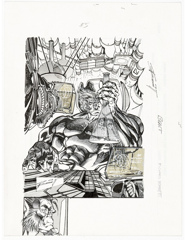 In the original art auction, Heritage has George Pérez and Romeo Tanghal’s The New Teen Titans #7 story page 15 featuring a nearly complete lineup with Cyborg, Starfire, Robin, Raven, and Changeling. Richard Bennett’s 1997 Fleer/SkyBox Marvel vs. Wildstorm #5 “Beastly Involvement” trading card art shows Beast flexing his mental muscles in his lab.