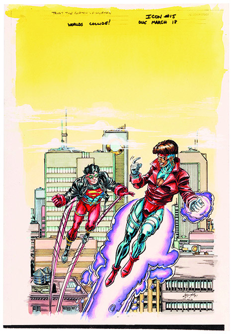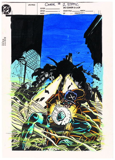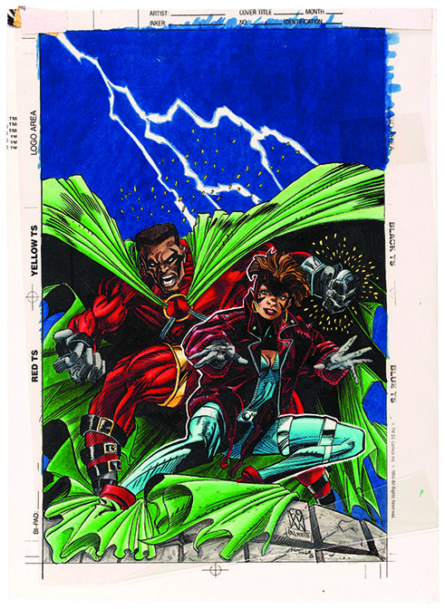 When we started at Milestone, I was the Color Editor and it was my job to work out how the books, and the whole Universe, should look color-wise. Skin tones (so many that Y40R40B25 wouldn’t do it), costumes, power effects, the city of Dakota, the bridge, the characters’ homes, Static’s lighting bolt and jacket and school, all of it. I pictured the books with a “natural” and “real” feel color-wise. Not a slick or limited palette, just kind of real. And so, it seemed that the best thing to do was to leave out the computer, and the person in between, the slick effects, etc. I thought if we painted the pages and they were the original, camera-ready art to be shot and printed from, we would get that feel for the Milestone Universe.