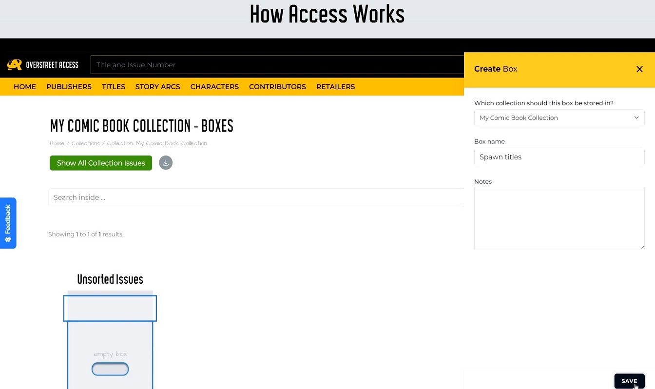 Overstreet Access automatically creates a collection for Gold and Silver subscribers by default. Collectors can rename this by clicking the pencil icon. Within a collection, subscribers can add individual boxes that reflect their physical collection. Add a box to the collection by selecting the plus sign at the top right and name the collection’s new box.