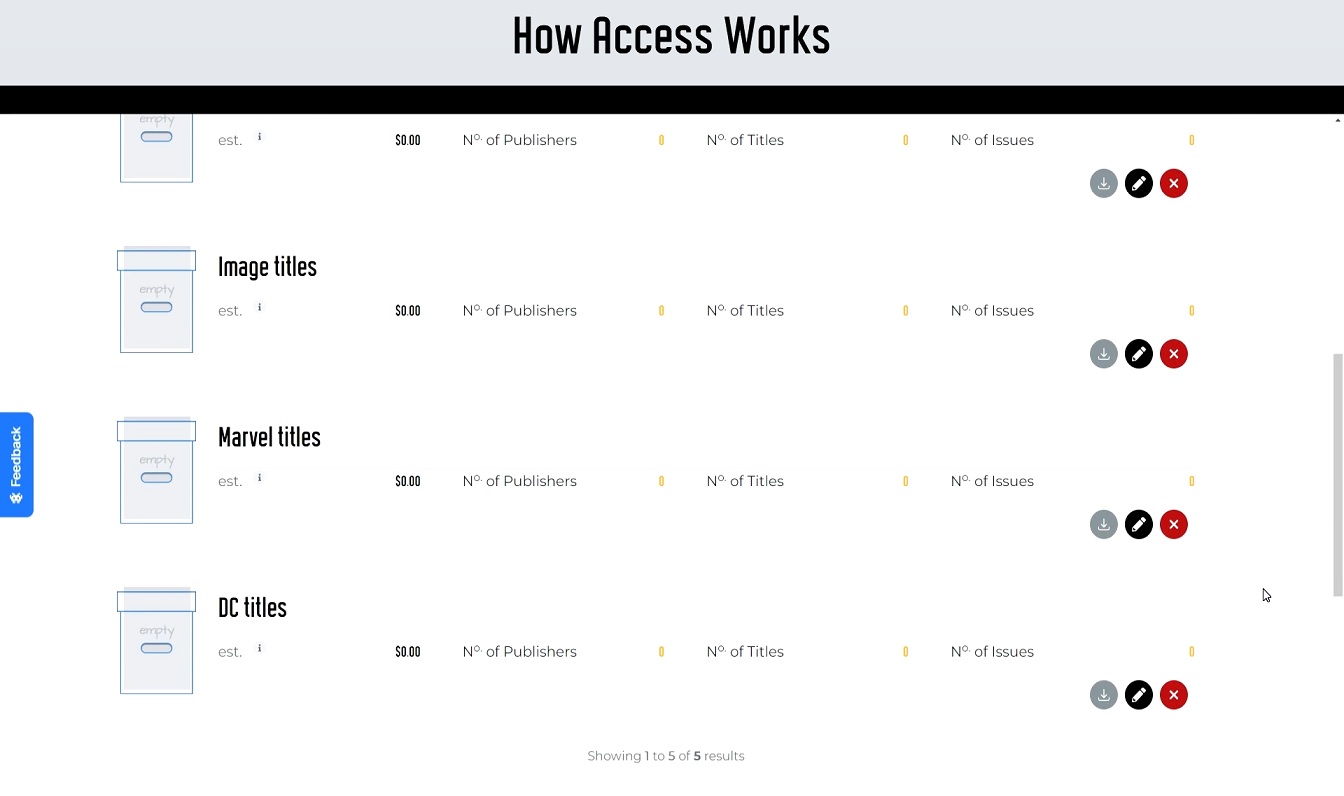 Gold subscribers can have up to five collections with unlimited boxes and unlimited comics, while Silver subscribers can create one collection with up to 5,000 comics. Bronze subscribers have access to the price guide information of Overstreet Access, but do not have access to the collection management functionality.
