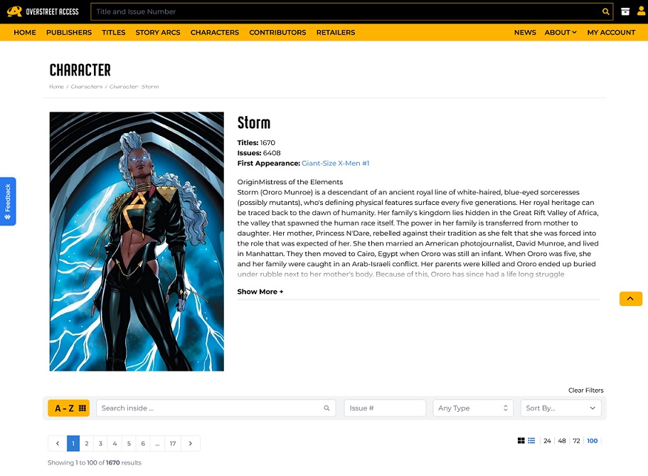 Below her biography, is the list of comic books that Storm has appeared in. Clicking on one of those titles brings up the book’s details, including the synopsis and number of issues. Under that is the list of issues that Storm appears in within that title. This helpful tool allows collectors to quickly find just the issues that their favorite character appears in, and easily add them to their want list.