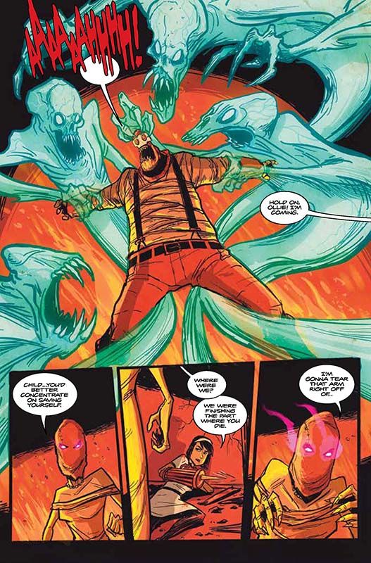 Reginald and Debby, with their mystical knife and prosthetic multitool gatling gun, are humanity’s only hope to defeat what’s beyond the veil. They find a lab with human test subjects and discover that the cult has been experimenting on people for generations. What’s worse, Reginald’s father might have had a hand in the horrors that have come from those experiments.