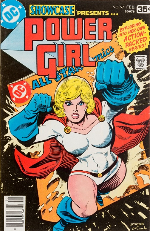 Gerry Conway, Ric Estrada, and Wally Wood created Power Girl, introducing in All Star Super Squad #58 (February 1976). When she was a baby, Kara’s father realized that Krypton was going to explode and put her in a ship bound for Earth. Though she was sent at the same time as Kal-L (Earth-Two’s Superman) her vessel takes longer to get to their destination and she arrives decades after her cousin. By the time she arrived, Kara was in her early 20s. Her age was later retconned to 18 in post-Crisis continuity.