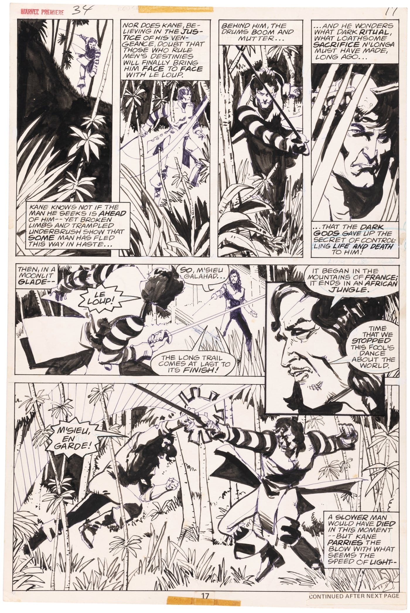 While not nearly as high profile as their Star Wars counterparts, the artist’s Page 14 from Marvel Premiere #32 (October 1976, Monark Starstalker) and Page 17 from Marvel Premiere #34 (February 1977, Solomon Kane in The Mark of Kane) are both noteworthy.
