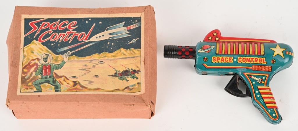 Even in the world of space toys, very good things come in small packages. An Alps tin friction Space Control pistol proved that point to be true. All original with bright colors and graphics, and accompanied by its original pictorial label box, it checked out at more than 10 times its presale estimate, selling for $8,100.